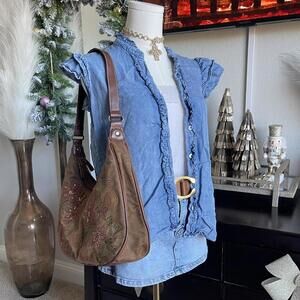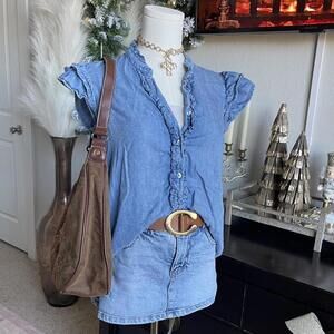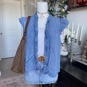 denim top, ruffle blouse, lightweight fabric, casual chic, vintage-inspired, boho style, tiered design, feminine details, soft blue, effortless fashion