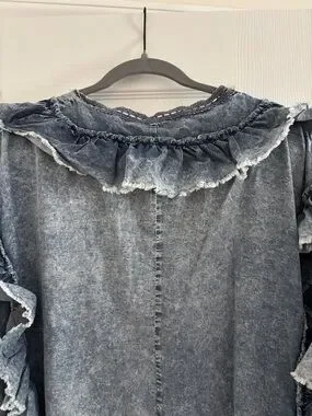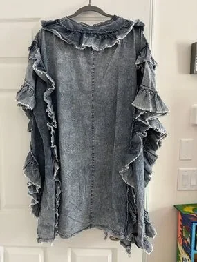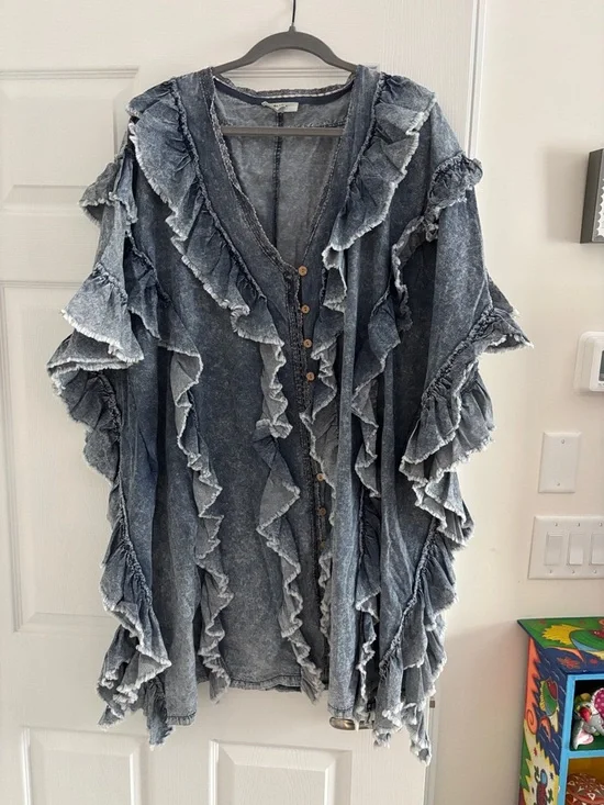 Lightweight denim-look kimono with layered ruffle trim. Button-front closure. Flowy, open silhouette. Soft washed indigo coloring.ptop about 29" length about 38". Very loose and flowing. It would fit anyone. There R armholes