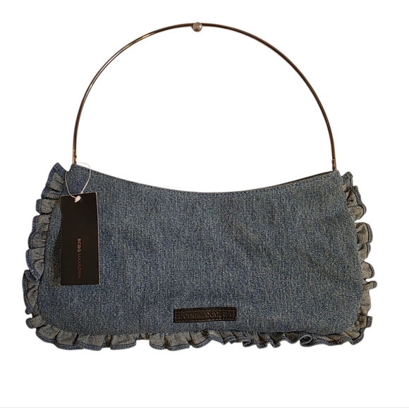 Stylish blue denim handbag with elegant ruffle detailing. Magnetic clasp and metal on top. New with tags and in great condition.