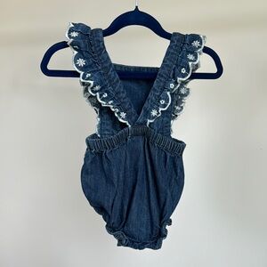 Adorable denim overalls with charming ruffle details. Perfect for playful days.