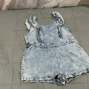 Stylish denim romper with ruffle details. Features a sleeveless design and pockets. Perfect for casual outings.