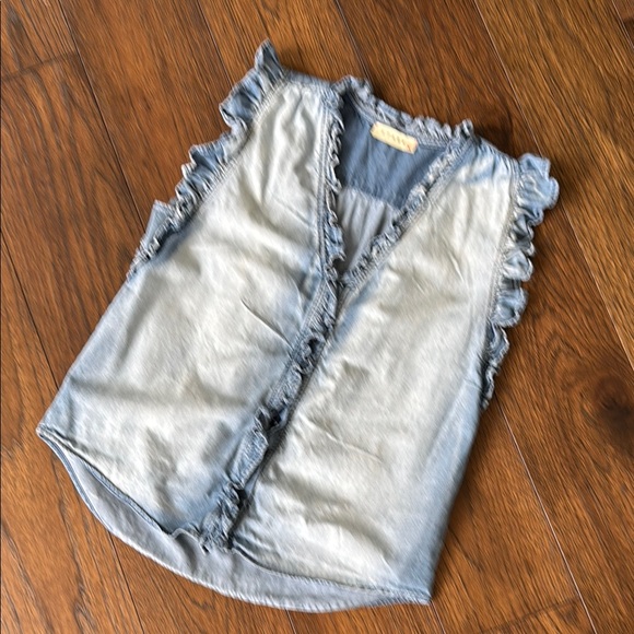 Stylish denim top with charming ruffle details. Perfect for any casual outing. 100% cotton.