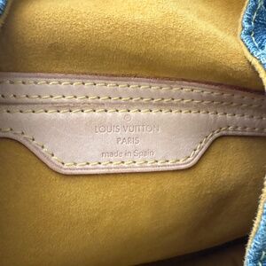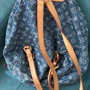 This is an authentic, gently used Louis Vuitton Denim Sac a Dos Backpack. It features external front pockets with polished gold press locks. It also has a top flap leather shoulder straps and a rolled top handle. It includes a saffron microfiber interior with a patch pocket.