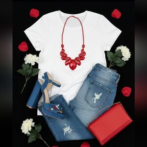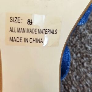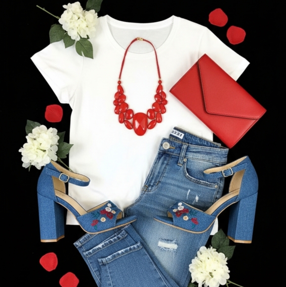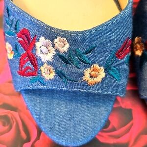 Colors: Denim Blue with Florals of Red, White, Cream and Green on Upper Strap.and Heels