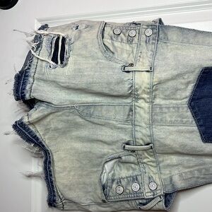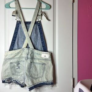 Stylish denim short overalls featuring a dark blue front pocket. Perfect for casual wear.