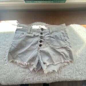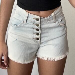 Keywords: denim shorts, high waisted shorts, button fly shorts, frayed hem shorts, light wash denim, casual shorts, summer shorts, womens shorts, jean shorts, distressed shorts, trendy shorts, fashion shorts