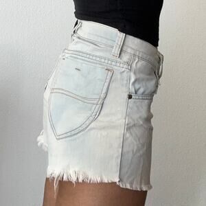 Light wash denim shorts featuring a high-waisted design and a unique button-fly closure. The frayed hem adds a touch of casual style, making these shorts perfect for warm weather. These shorts offer a flattering fit and a trendy look. Ideal for casual outings, summer festivals, or beach days.