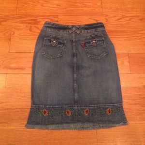 A nice denim skirt, fit very nice 2 back pockets, both side buttons and zippers and a nice embroider by the hem.