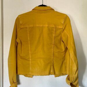 A slim-fit denim style jacket with a frayed hem in a fun fresh summer yellow. A fun way to add that must-have pop of color to your wardrobe this season.