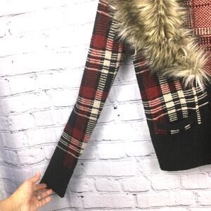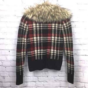 Denim & Supply Ralph Lauren VTG Faux Fur Removeable Collar Button Down Long Sleeve Acrylic Wool Blend Black Red Plaid Knit Cardigan Women's Size XS