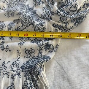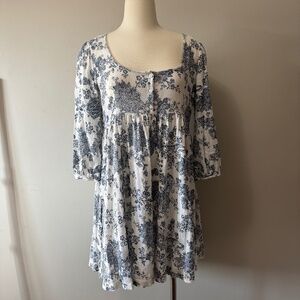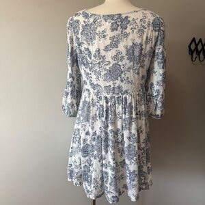Stylish mini dress with blue floral design. Features scoop neck and three-quarter sleeves. Ideal for casual wear.