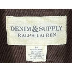 This SMALL quilted cotton vest from Ralph Lauren's Denim & Supply line features a brown corduroy collar, a red and brown buffalo plaid pattern, and zipper and button closures. It is in very good condition from a smoke free home.