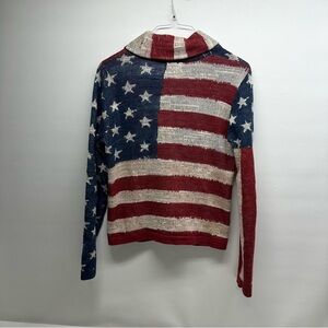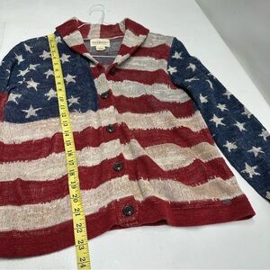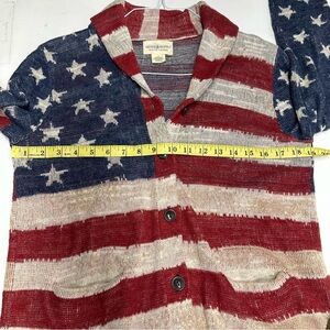 Stylish cardigan with American flag design. Features stars and stripes in red, white, and blue.