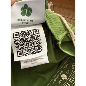 Features green cotton fabric with bold "Denim" embroidered design on the front in tonal stitching