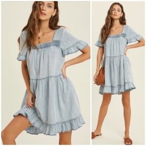 Adorable light wash denim babydoll dress featuring short sleeves with ruffled trim, a square neckline with elastic stretch smocking along the top, ruffle trimmed bottom hem and a flowly comfortable babydoll fit.