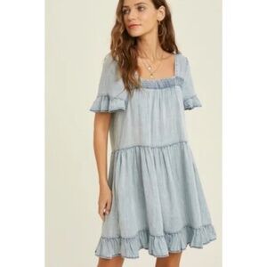 Adorable light wash denim babydoll dress featuring short sleeves with ruffled trim, a square neckline with elastic stretch smocking along the top, ruffle trimmed bottom hem and a flowly comfortable babydoll fit.
