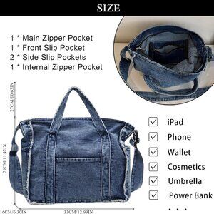 SIZE & CAPACITY: The size of this denim purses for women is about 15.35*4.72*11.81in. The large capacity design makes it easy to accommodate iPad, mobile phones, folders and other items, which is very suitable for daily commuting and travel.