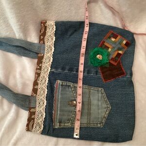 Chic denim tote bag featuring elegant lace and vibrant patchwork. Ideal for everyday use.