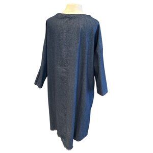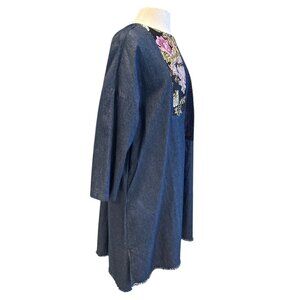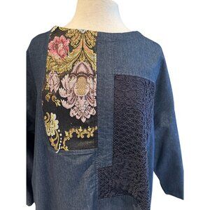 This denim tunic dress offers a relaxed fit with artistic floral and lace patchworks for a unique touch. Its frayed hem and 3/4 sleeves add casual elegance.