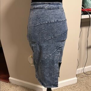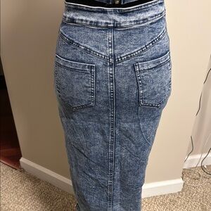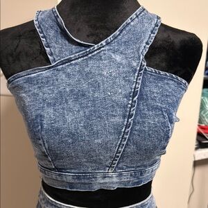 Stylish denim two-piece set with a crop top and skirt. Perfect for casual outings.