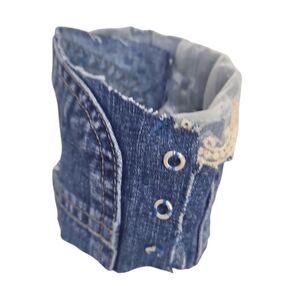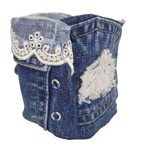 Add a touch of rustic elegance to your wardrobe with this one-of-a-kind vintage-inspired cuff bracelet. Designed with delicate floral scalloped lace over denim, this accessory is perfect for lovers of boho-chic and cottagecore styles. The sparkling crystal button adds a hint of glamour, making it a versatile piece for both casual and dressy occasions. Lightweight and comfortable, it’s the ideal statement bracelet to elevate your look effortlessly.