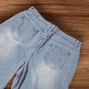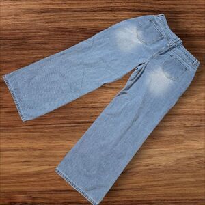 No brand tag. More of a lighter weight Denim. Wide bottoms. Size says. XL..see measurements for more accurate description. Light stretch