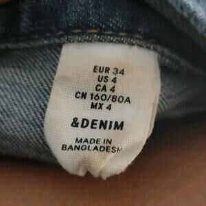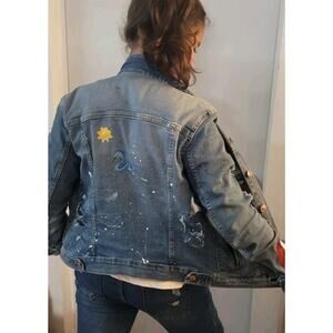 & Denim Womans Sz. 4 Jean Jacket Thrashed Slashed and Painted Pockets 99% Cotton. Hand painted and modeled by the artist. Some slashes, staining and marks. 1% elastane for stretch and softer feel.