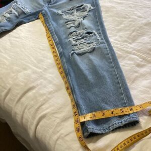 Distressed condition, has been repaired at waist band ( see pic 4), boyfriend cut, med wash, tagged size 10, see measurements for custom fit.