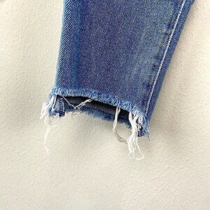 * Features: artful fading, soft worn in light blue wash, 5 pocket styling, high rise, button closure, zip fly, raw hem, black lambskin accented belt loop
