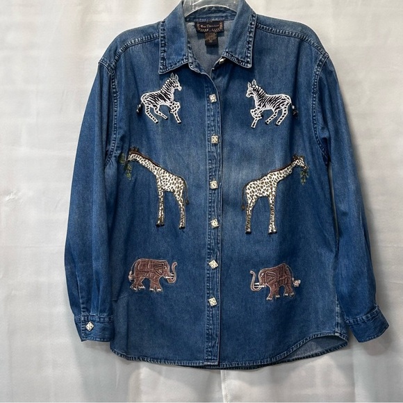 Denim Zoo Animal Artsy Boho Embroidered Women’s Shirt Size M