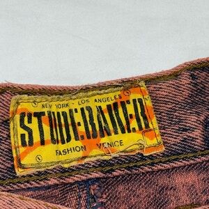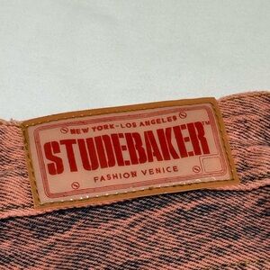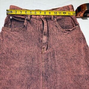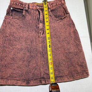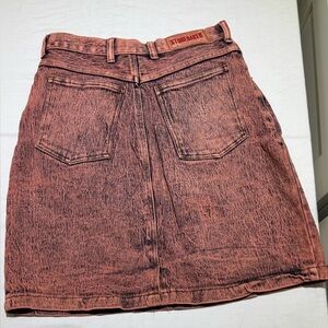 Studebaker pink acid washed denim skirt perfect for casual outings. Features a classic design with a modern twist. Fabric is stretchy and comfortable. Perfect for a retro look.