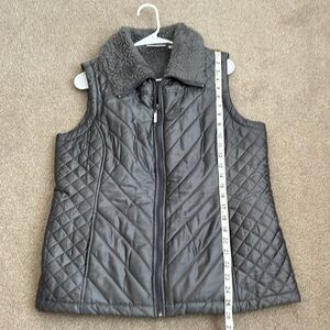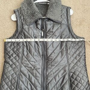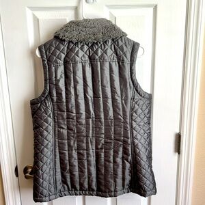 Keywords: quilted vest, faux fur collar, sleeveless vest, puffer vest, gray vest, Denim & Co., women's vest, small vest, casual vest, outerwear, fall fashion, winter fashion, cozy vest, warm vest