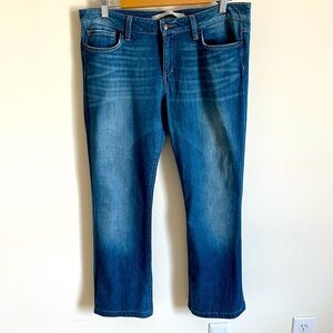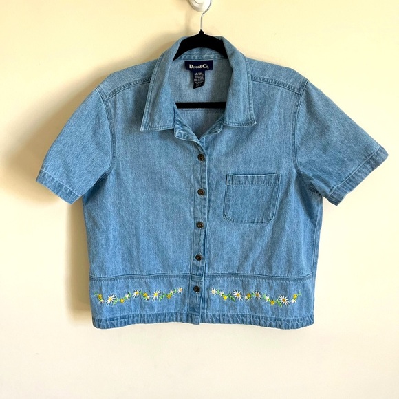 Denim and Co. cropped floral embroidered denim button up shirt Sz Large