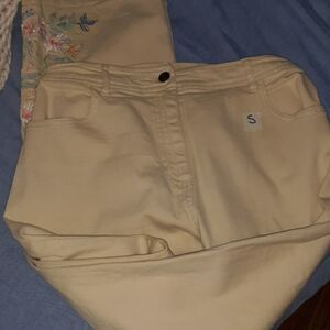 denim company size small cream colored ladies pant 98% cotton 2% spandex embroidery made in China hand wash straight cut high rise