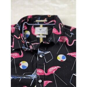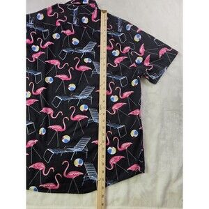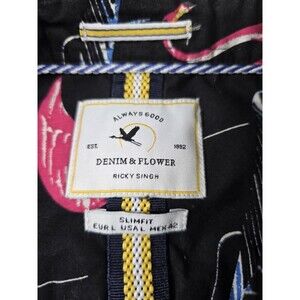 The Denim and Flower Men's Large Ricky Singh Flamingo Beach Shirt is a stylish and versatile button-up shirt perfect for various occasions such as travel, wedding, party, casual, formal, and business events. Made from cotton fabric, this shirt features a collared neckline, spread collar style, short sleeves, and a slim fit design. The graphic print of flamingos adds a fun and tropical touch to the shirt, making it a fashionable choice for the summer, fall, and spring seasons. Perfect for those who appreciate a Hawaiian or tropical theme in their clothing.