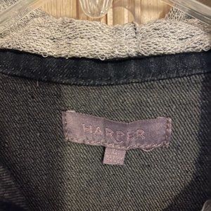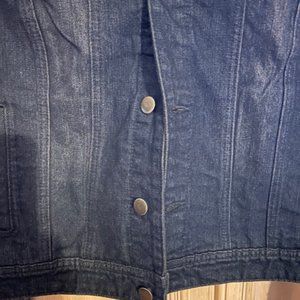 Denim bomber cut jacket with knit sleeves and hood. Cotton & Polyester. Great casual piece.
