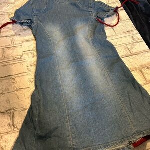 Stylish denim kids dress with vibrant red accents. Perfect for casual outings.