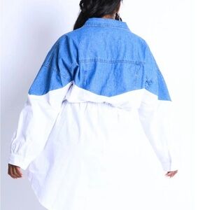 Elevate your style with the Denim Blues Tunic Dress! This distressed denim and white dress features a figure-flattering drawstring waist and is true to size with minimal stretch. Perfect for a casual yet chic look.