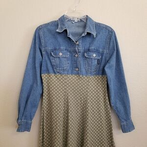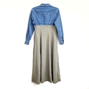 Stylish denim top with a flowing patterned skirt. Perfect for casual outings or a day at the office. Embrace comfort and style with this versatile piece.