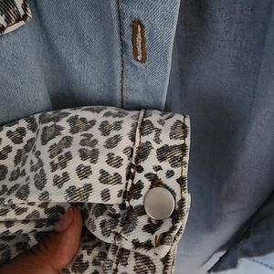 heavy duty denim and leopard print jacket with buckles down the middle and on the wrist. has 2 front pockets. the length hits pass the hips and butt. for reference, I'm 5'2. fairly new. bought off Amazon for 40$. no name brand but great material.
