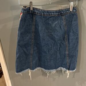 Edgy Distressed Denim Mini Skirt with Side Stripes. This trendy denim mini skirt features a classic blue wash with a full button-front closure and two chest-style flap pockets. Its standout details include stylish red, navy, and white racing stripes down the sides, and a heavily distressed, frayed hem, adding a cool, worn-in look. Perfect for a casual, rebellious, and fashion-forward statement!