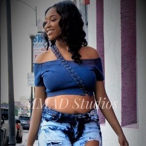 Off shoulder cross strap woven detailed denim crop top. Chrome zipper. 65% cotton, 33% polyester, 2% spandex.