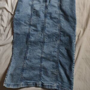 Never worn but has no tags. I am too flat chested for it but otherwise so pretty and clean. Denim material has give and straps can stretch. Slit on right side. Can dress down or up.