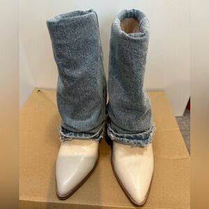 Stylish denim and cream western boots with pointed toes. Perfect for a trendy look. Excellent condition.