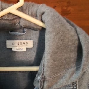 Juniors size large denim jacket with removable gray hoodie. Has four inside pockets. Worn once.