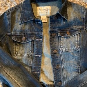 This jacket is a beautiful distressed dark wash jacket in size small. It has cute distressing details on the front pockets and along the back that give it that worn in cozy feel. This jacket is perfects over a sundress or layered with a tee. It is in perfect condition with no rips stains or tears.