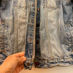 denim jacket has zipper n button clips