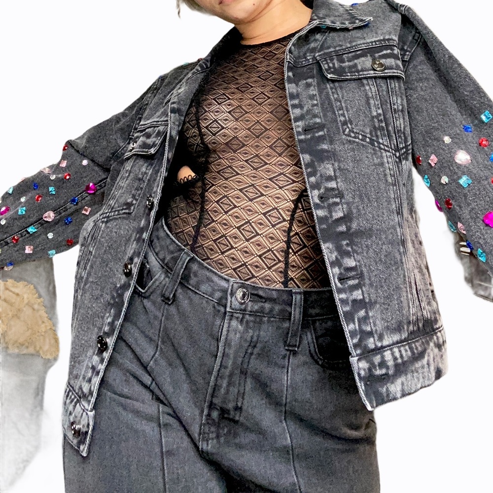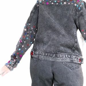 Black denim jacket decorated with colorful rhinestones! Perfect, edgyUnique look -