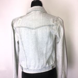 Denim jacket, distressed, NWOT, high quality, stylish, great wardrobe piece. They run a little small. Go up a size.