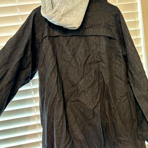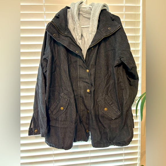 Denim jacket with removable hood and lining.